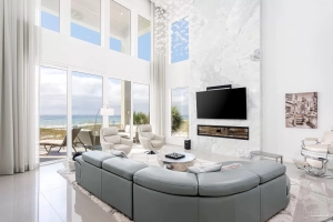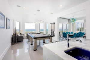 This spectacular, Gulf front 5 bedroom, 5 bath mansion exudes an air of sophistication redefining coastal living. The home was stunningly designed and decorated by the owner, who is a beloved New Orleans icon. Offering an array of features, the interior is a symphony of modern design. You’ll be captivated by the full-length glass sliders and upper windows in the living area, accentuating a granite wall with a mega TV, an natural gas fireplace and a magnificent 2-story chandelier.