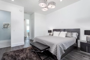 The elite gourmet kitchen has a center island with 5 barstool seating. It’s equipped with high grade appliances, including, a Sub-Zero double refrigerator with lower freezers, a Bertazzoni Master Series Stove and double oven, a Dacor 30” microwave, Paykel double dishwasher, a Hoshizaki ice maker, and trash compactor. The dining area sparkles with full windows, a hand-blown glass chandelier and a table for ten. The bright entertainment room boasts a Brunswick pool table, TV, and a wet bar with seating and ice maker. On the upper level is a tranquil sitting area with a beautiful view and elevator access, leading to ‘his and hers’ master bedrooms with walk-in closets and built-ins; one with a mini-fridge and microwave; the other with an additional makeup area with sink.